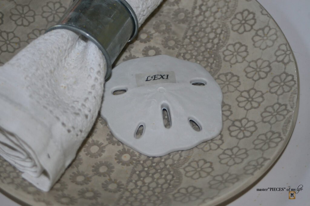 I love the personal touch place cards brings to a table. I also love to add a token gift or accent to place settings. Using a label maker I added everyone’s name to faux sand dollars and Viola! personalized coastal place cards.