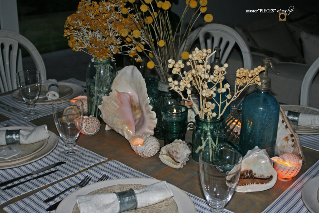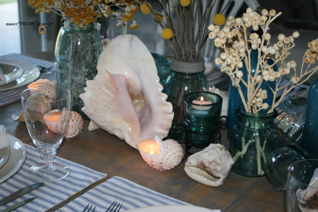 Beautiful coastal tablescape. Love the blue and white ticking placemats! I really noticed the Ball jars in the centerpiece. I went antiquing today in Clarksville, TN, and was looking for blue Ball jars but wasn’t able to find any.