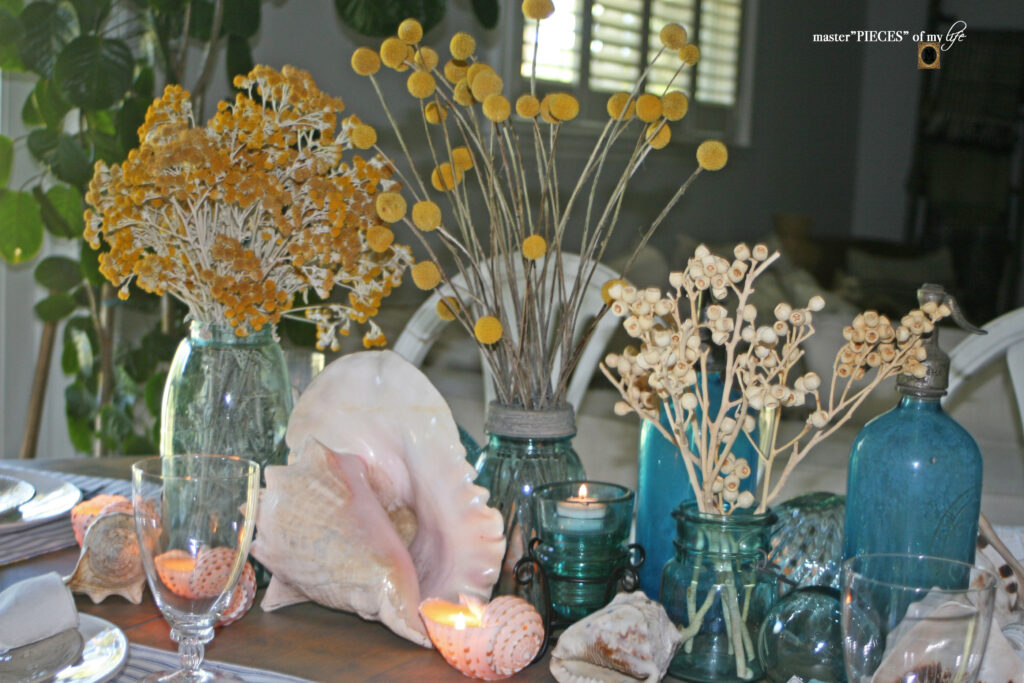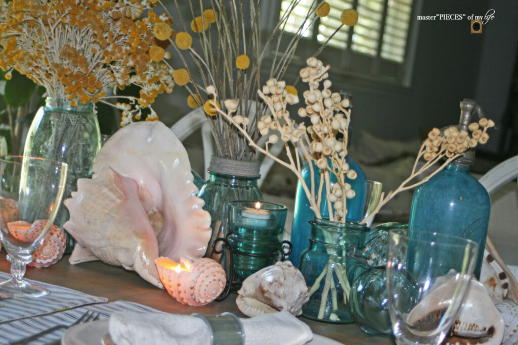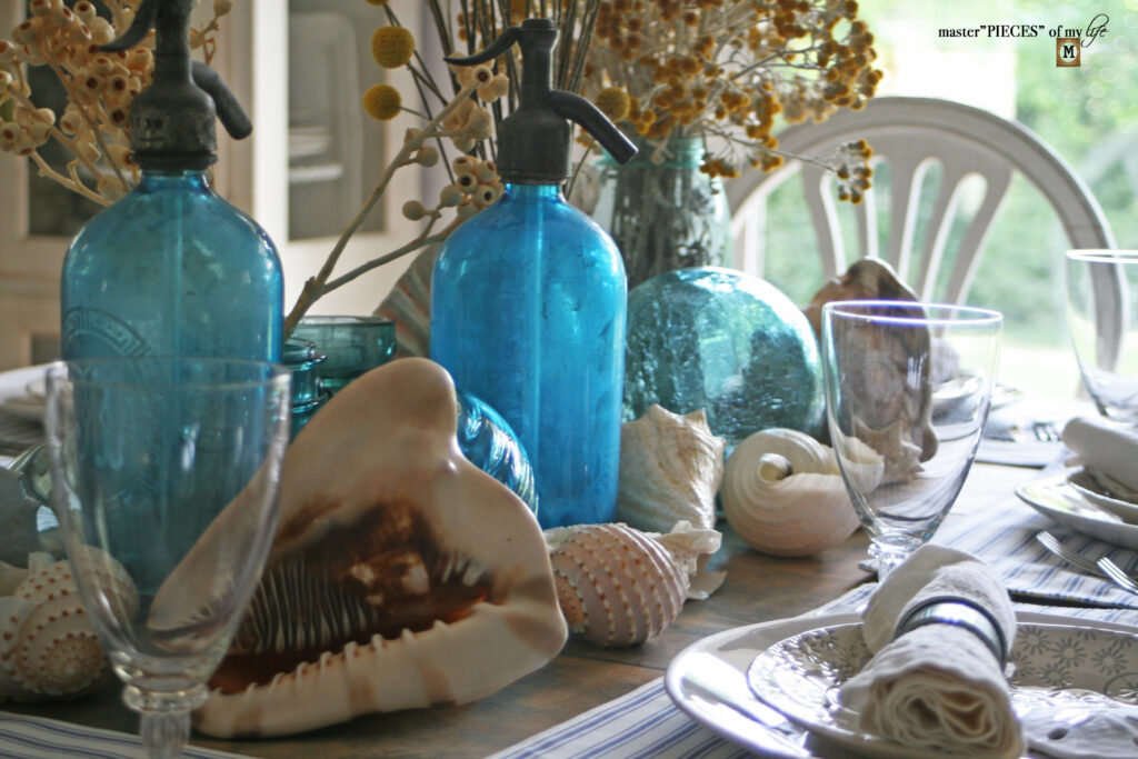 The table sports blue glass jars, bottles and spheres, which echoes the blue ocean, while the sea shells and sand dollars provide all the coastal feels.