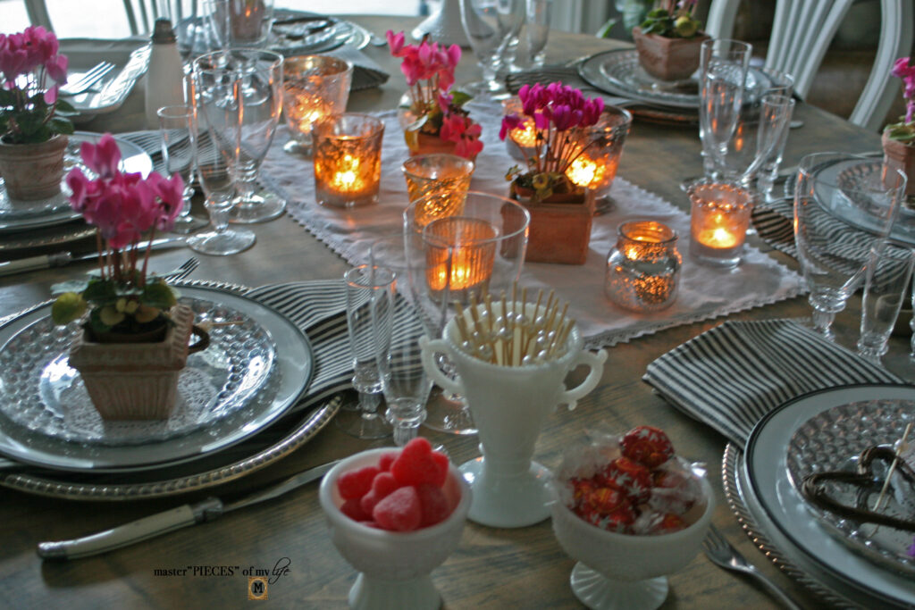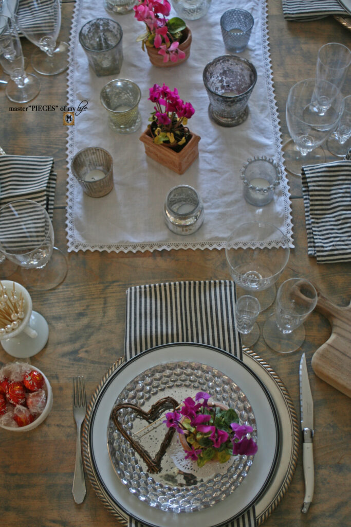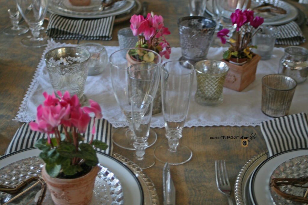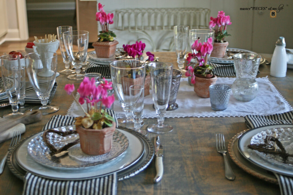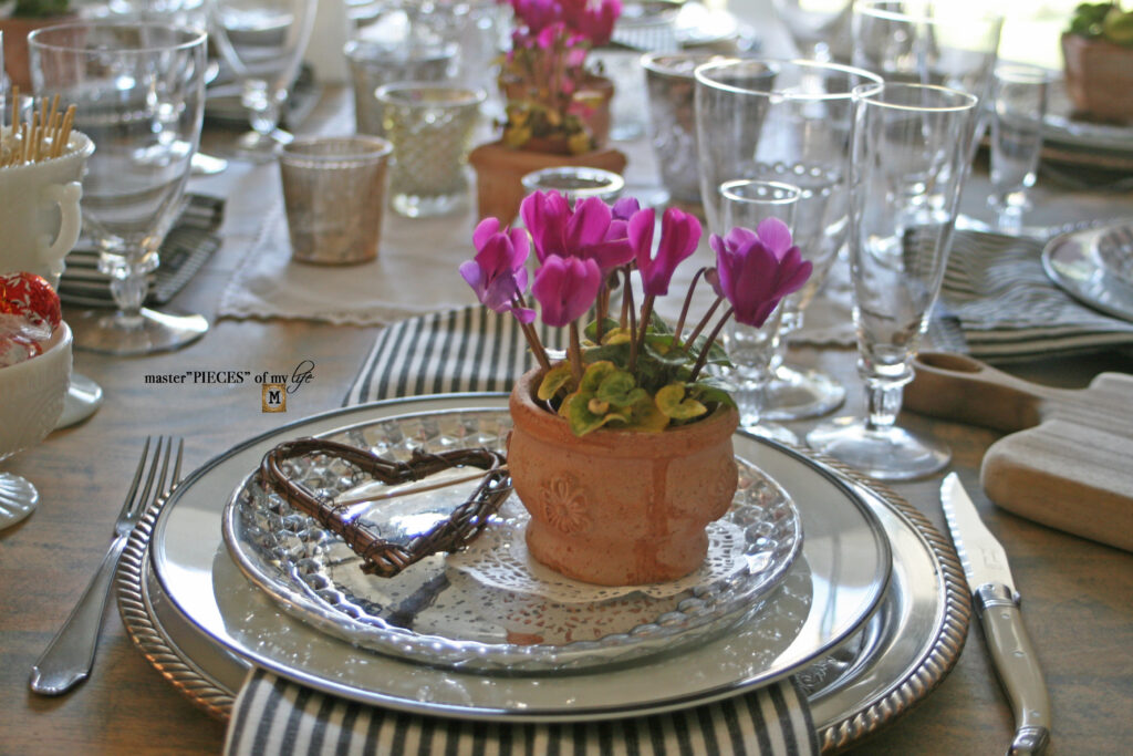 A theme will help spring board your table. As I explained above, the mini cyclamen were my inspiration. I used the mini potted flowers all around the table like a little Cupid fairy came and sprinkled them all around the table.