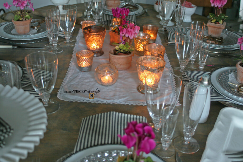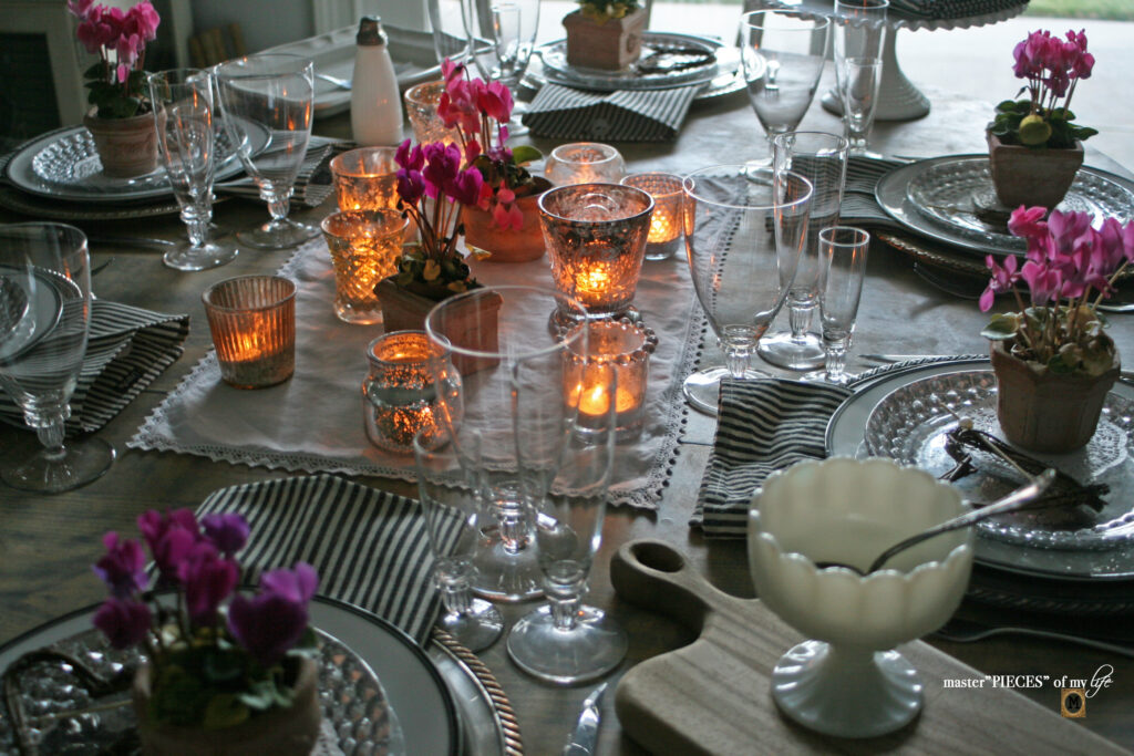 A more casual table relaxes everybody for a fun evening with much laughter and merriment. I used an eclectic mix on my table with glass accent plates, striped linen napkins, my parent’s simple crystal glassware, thrifted silver tray chargers, vintage milk glass pieces and more. It makes for an interesting and finished table, but it’s not too fussy or formal.