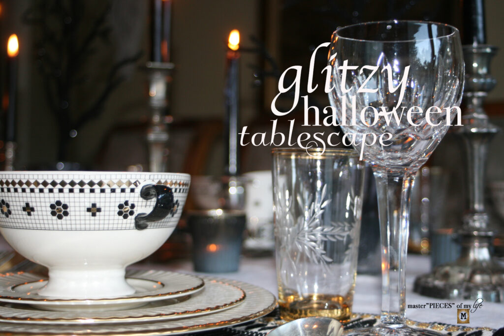 The black and gold vibe makes for a moody tablelscape for the halloween season, but yet keeps it fancy and refined. The gold accents coupled with our wedding Lenox china and Waterford crystal and my parents sterling flatware elevate it to an elegant setting.