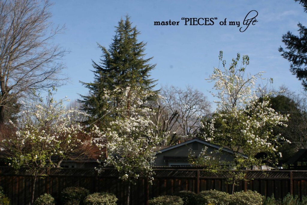 We have 5 pear trees in the backyard and they bloomed unseasonably early. now I don’t want to sound like I’m complaining, ‘Cuz I’m not. I’m SO not. I feel terrible for all the folks under so much snow. Growing up back east, I get it. And I very much appreciate the good weather I enjoy now.
