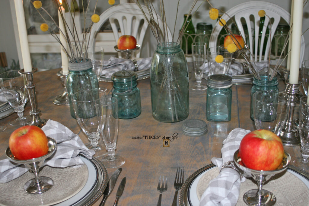 The vintage ball jars with the dried Billy balls are a happy color combination, which feels summery, but the apples are a nod to the autumnal harvest.  All the other elements are in a neutral color palette between whites, grays and silver, allowing the apples, ball jars and Billy balls to pop and be the stars of the show.