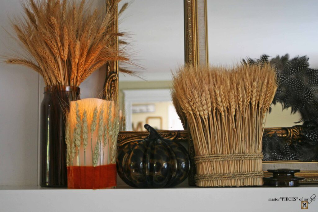 The mantel design is comprised of three main components, which include the wheat bundles, the tortoiseshell glass pumpkins and the candles. That’s it.