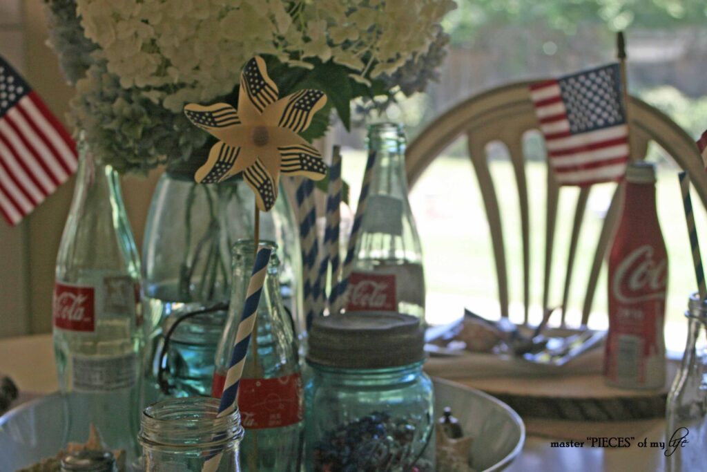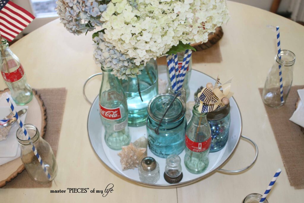 For the centerpiece I used my vintage Ball jars and hydrangeas from the garden. My blue ones are really faded but I like the soft hues. Extra Coca-Cola bottles, sea shells to add to the summer feel, salt&pepper shakers and some 4th of July giveaways we pick up every year at the downtown parade are mixed in the centerpiece.