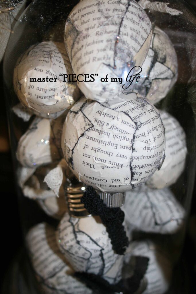 For some decoupage book print love, plastic ornaments are also a great foil.