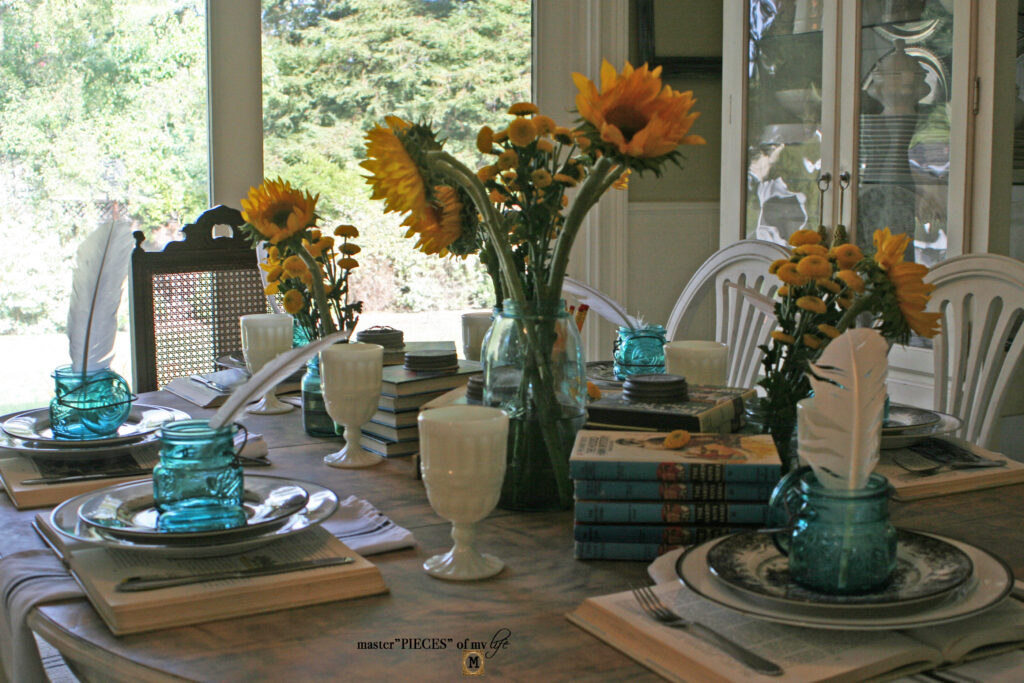 Each place setting is also adorned with a vintage blue Ball jar and a white feather, evoking a writing quill of timeworn times. All the table top items, plates, silverware, glasses, etc. are all everyday items we use regularly.