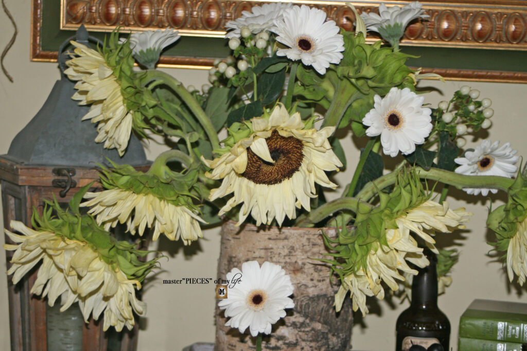 The garland adorns the front hall mirror, draped loosely and creating a fall vignette to welcome all that come through the door. I found these white sunflowers and fell in love with them as soon as I saw them. Don’t get me wrong, I like traditional sunny yellow sunflowers, but these just caught my eye right away. They felt like farmer’s market flowers rather than grocery store flowers, which is where I found them. I paired them with white Gerber daisies and white berries, keeping the palette very neutral.