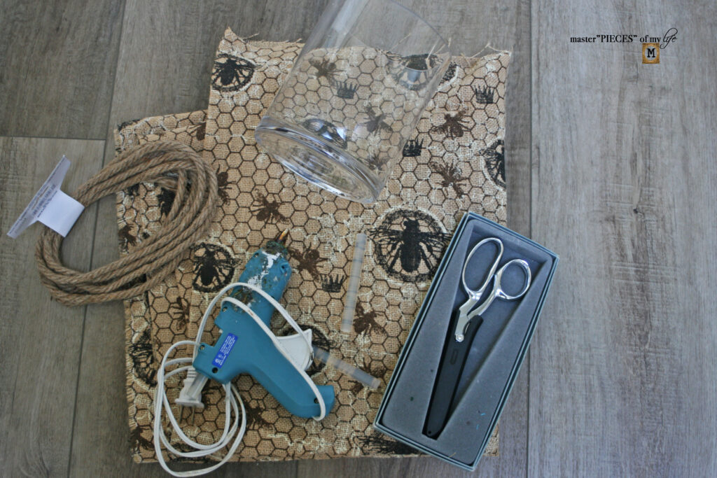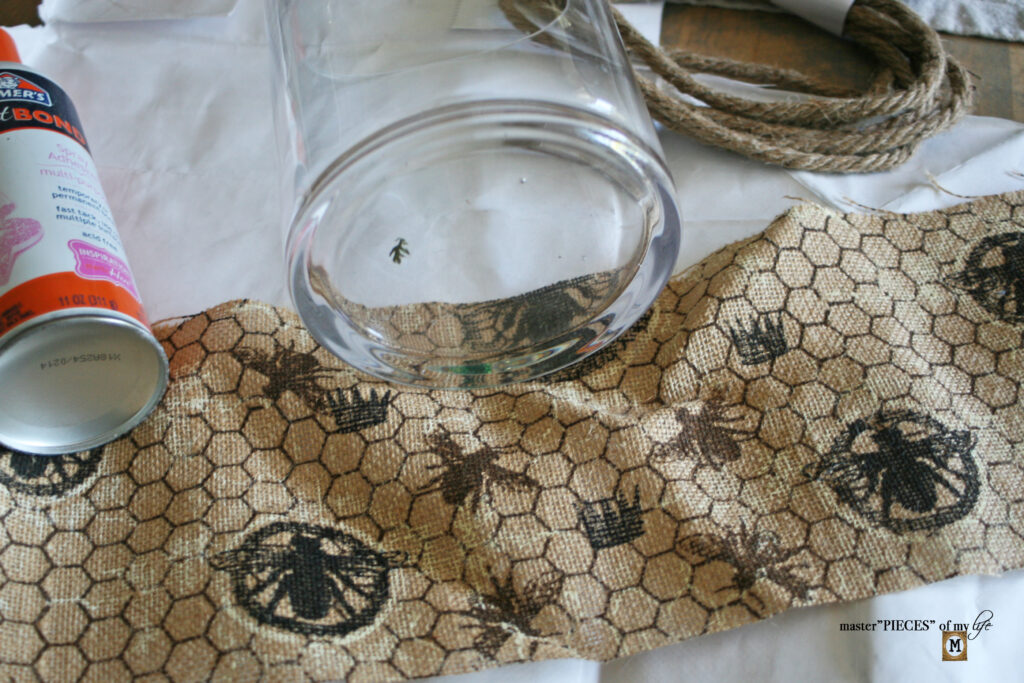 - Cut a piece of fabric that is the height of the glass container and can go all the way around overlapping slightly where the ends meet around the container.