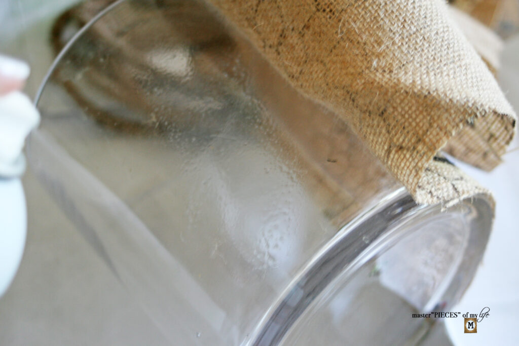 - Adhere the piece of fabric around the glass container using spray adhesive.
