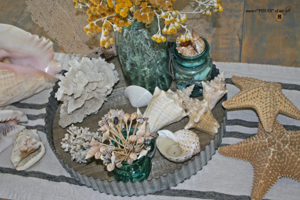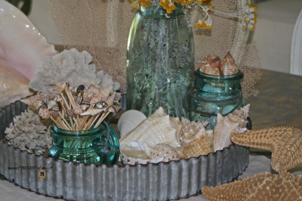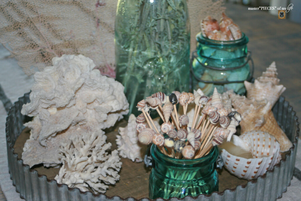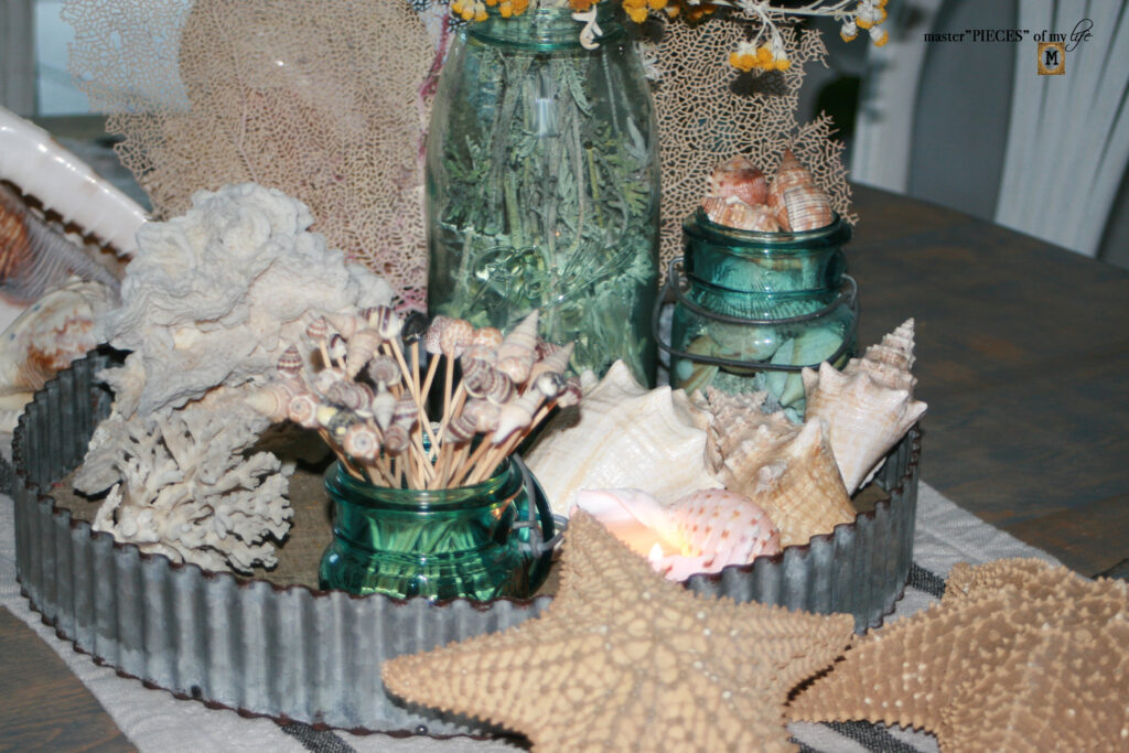 There are three different types of sea life on the tray. The large sea fan is a great backdrop behind the large Ball jar. The sea shells are grouped together balanced by the sea coral on the other side of the tray.