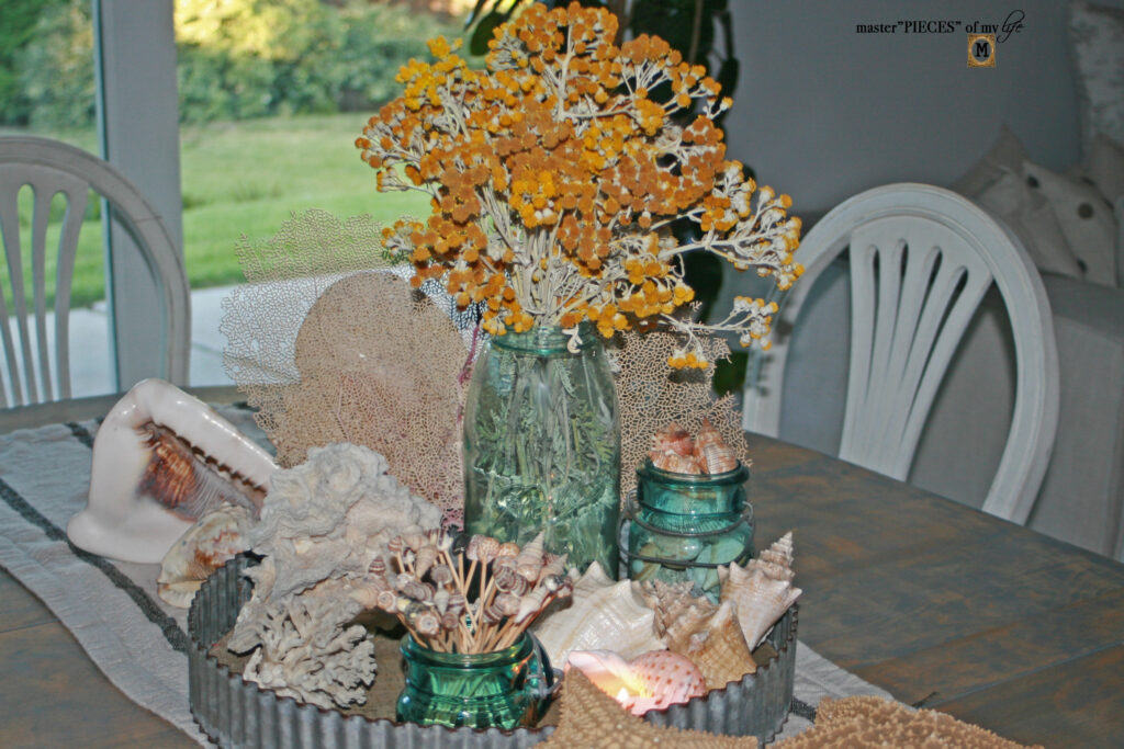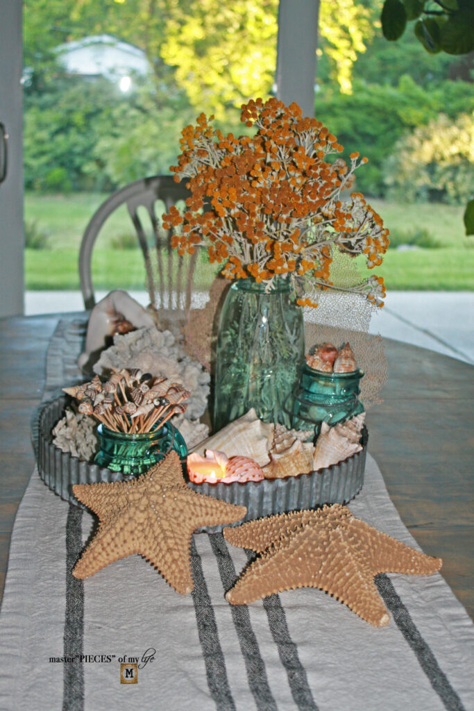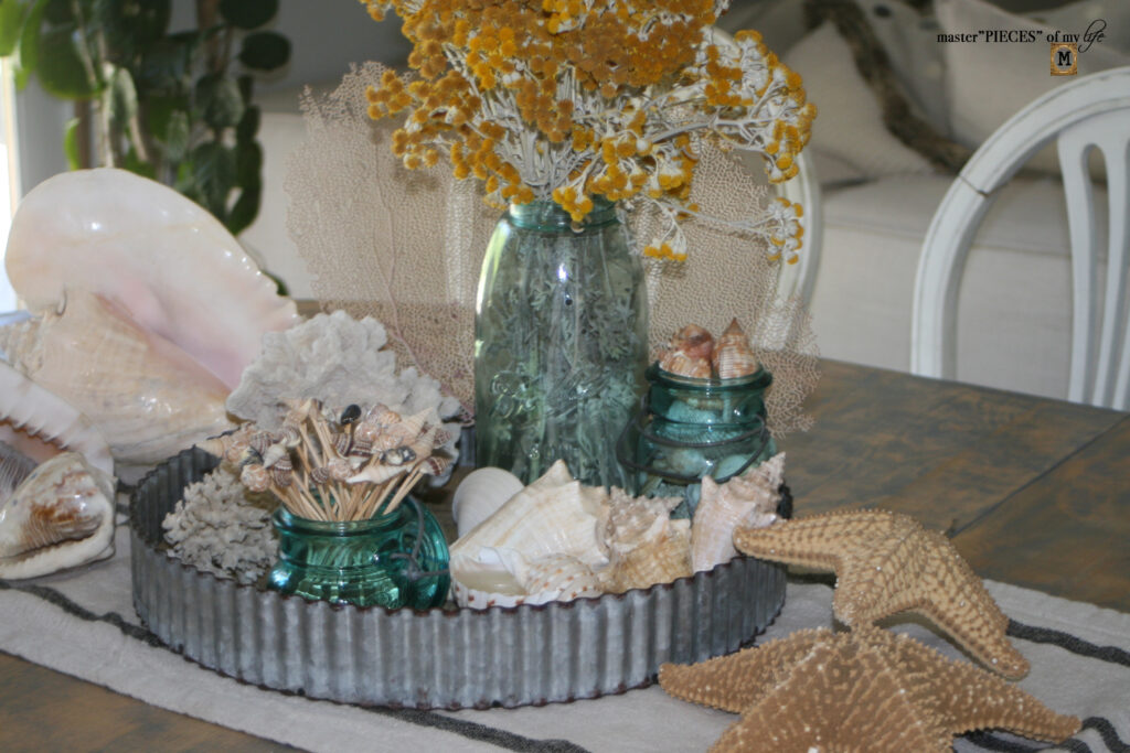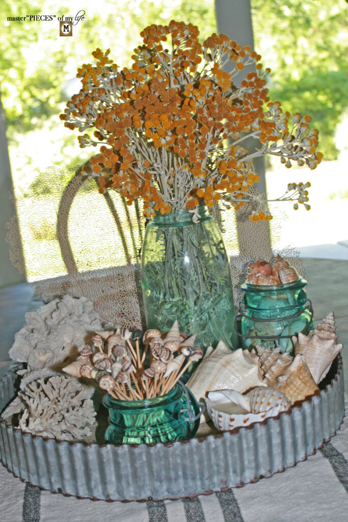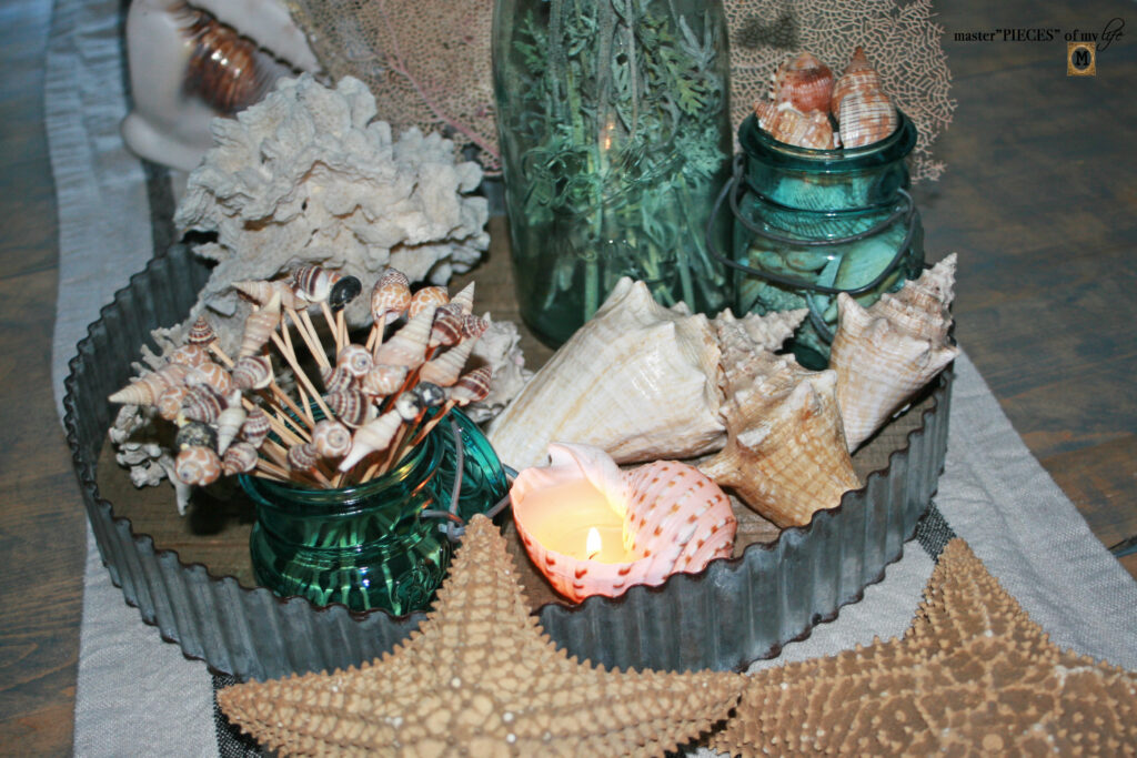 There are three different types of sea life on the tray. The large sea fan is a great backdrop behind the large Ball jar. The sea shells are grouped together balanced by the sea coral on the other side of the tray.