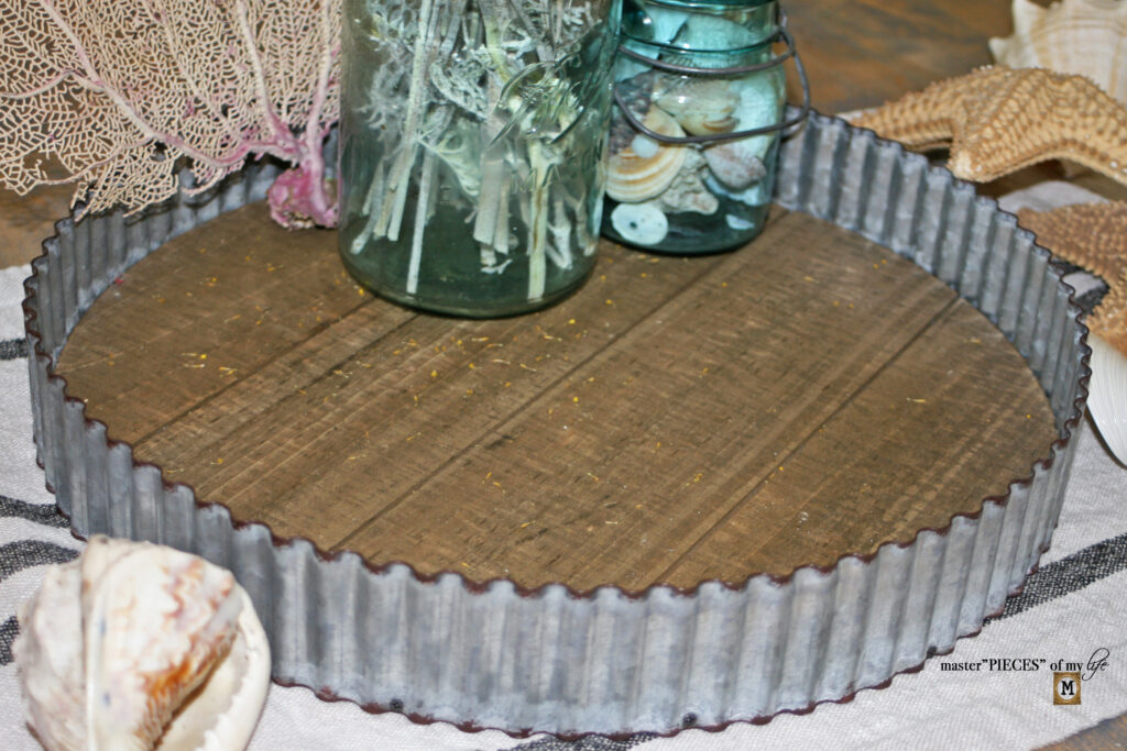 ??Tray- I used a barnyard tin tray for this project. The base of the tray is wood and the edges are corrugated galvanized tin. It has a great casual feel, which I thought was appropriate for a laid back coastal theme.