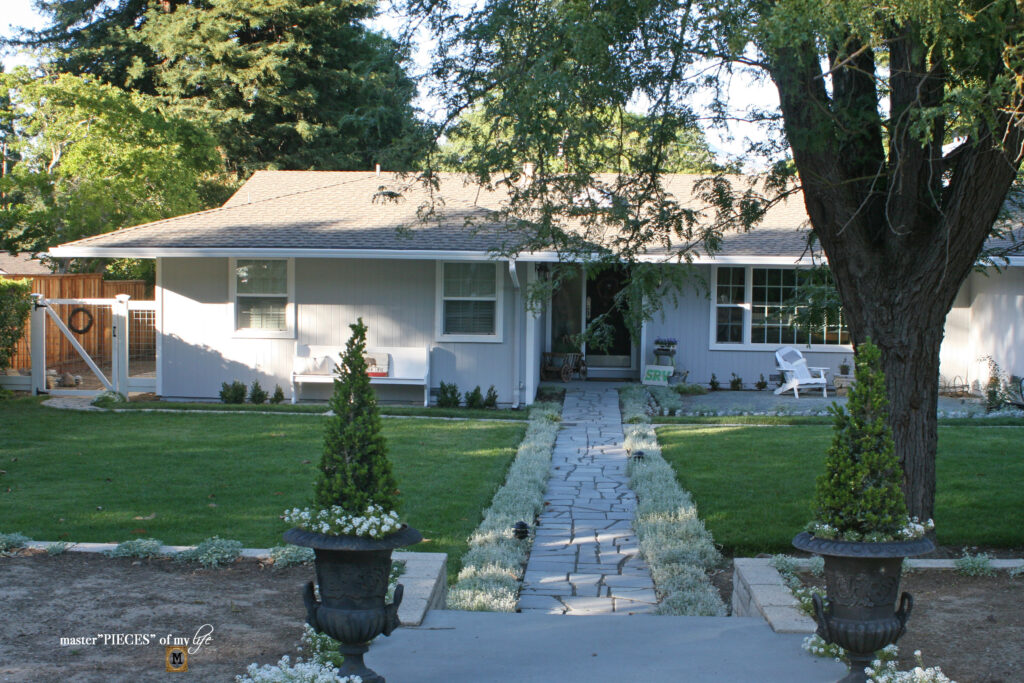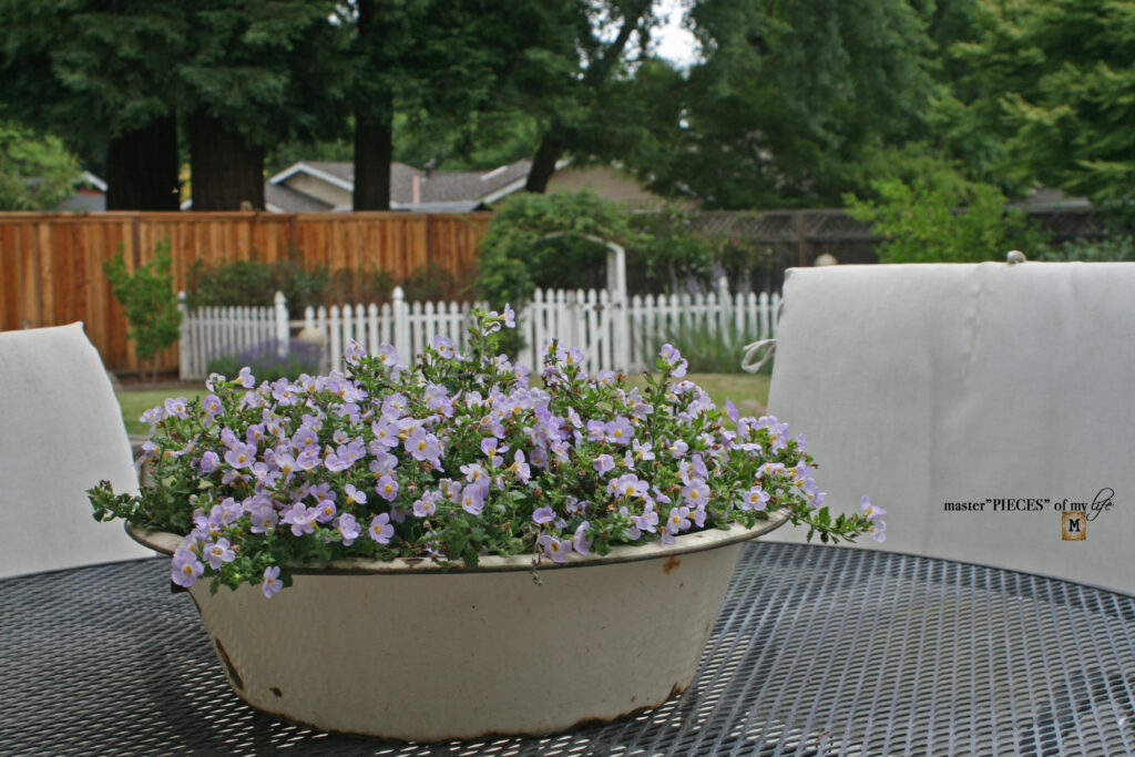 This large vintage enamel basin is our permanent centerpiece on the back patio. For many years it was planted with succulents, which lasted all year long through the winters. Eventually the succulents became too leggy and were transplanted to a new planter. In this case as soon as I saw the basin I knew I wanted to use it to plant in it. Although, I was worried dirt might escape and spill out the side since it had some holes. Luckily we’ve never had that issue.