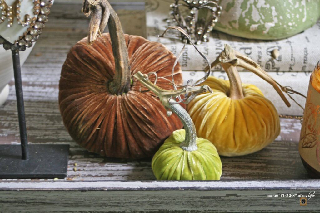 Seasonal touches in the foyer are always changing, keeping the space interesting and different. The wooden pears and vintage books have been replaced with a collection of velvet pumpkins in my favorite fall colors. You can read about ways to transition into Fall using colors and other elements here {how to start transitioning to fall decor slowly}.