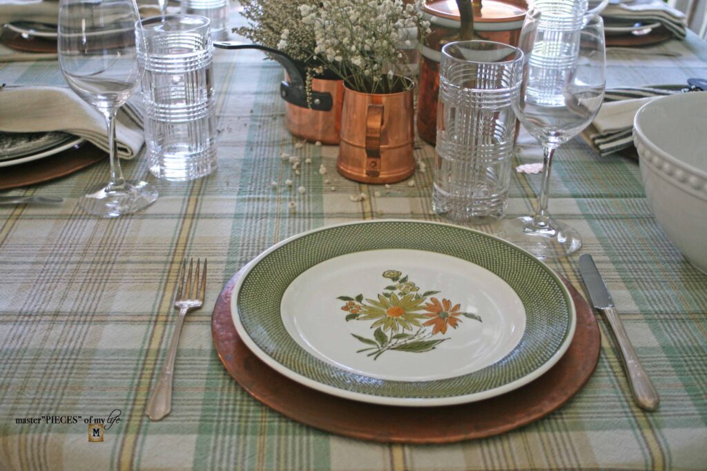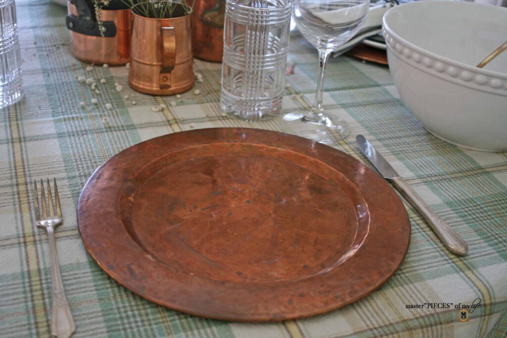 The place stack starts with my parents copper chargers. I love the patina they have and they tie the centerpiece pieces to the rest of the table.