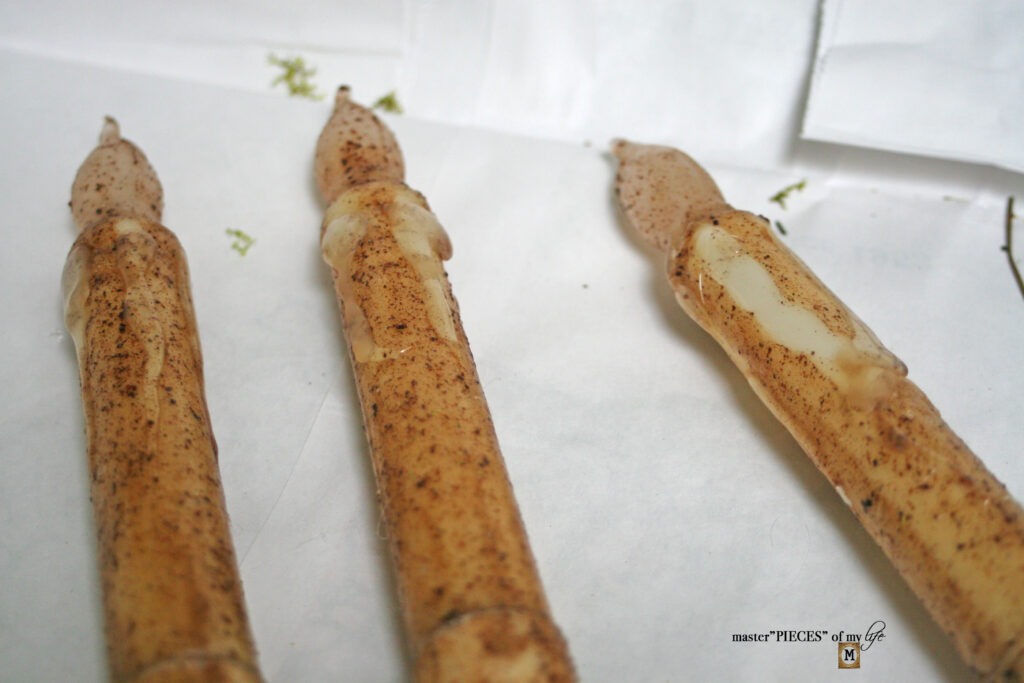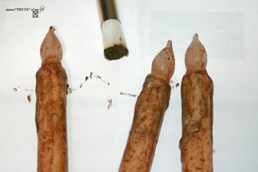 ??5. After the hot wax has dried completely, add dark furniture wax to blend with burnt finish of candles. I used a stenciling brush to apply the dark furniture wax to the candles. I dabbed the dark wax until it blended with the original burnt finish of the store bought candles.