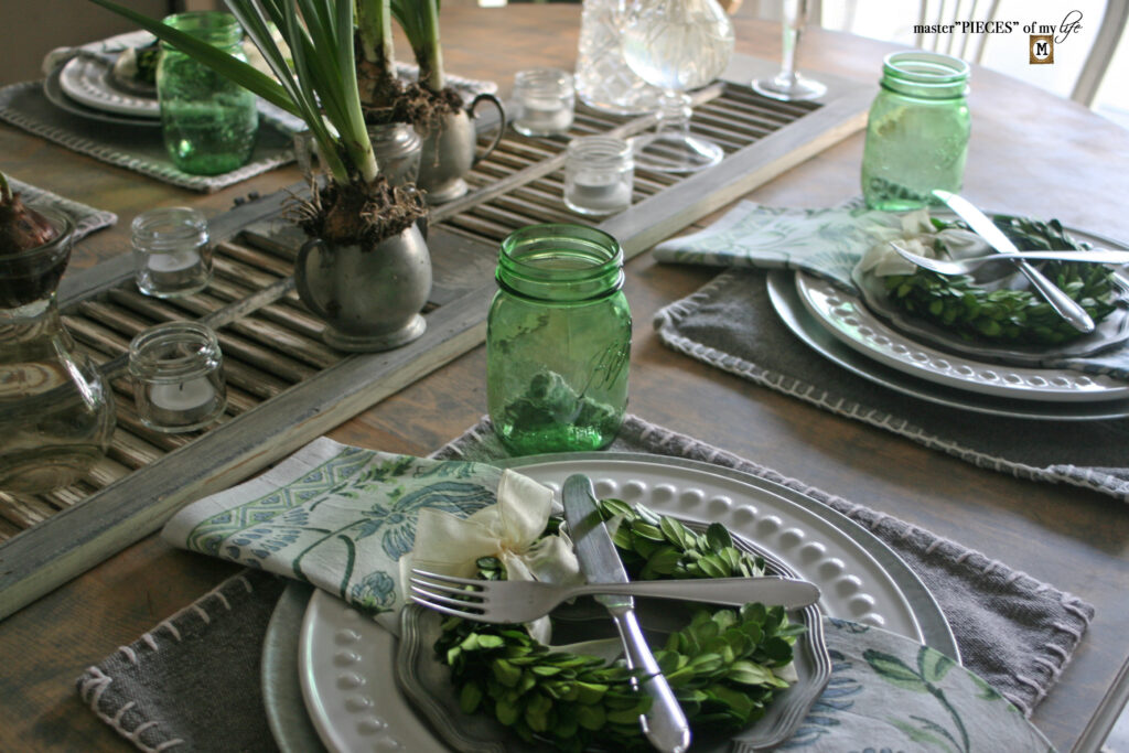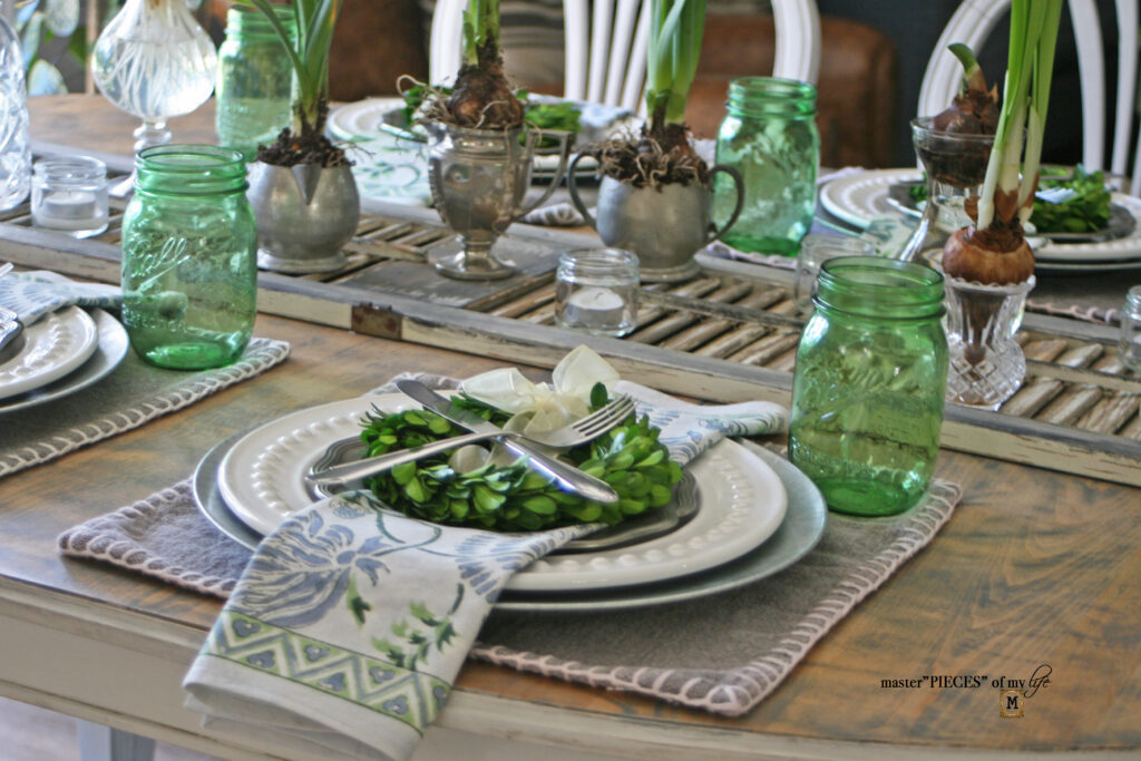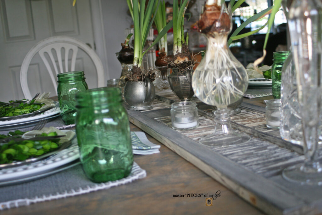 The color of the spring green ball jars compliment the boxwoods, linens and bulbs themselves, which I absolutely love. Green is my favorite color and the color of these green ball jars just scream cheeriness to me.