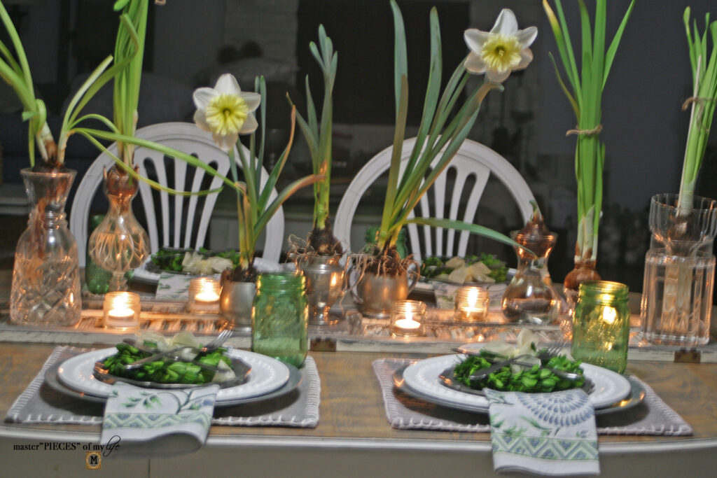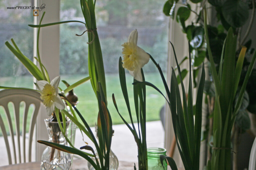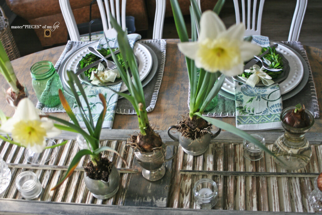 The bulbs are a mix of Daffodils planted in pewter pieces while the Narcissus {paperwhites} are forced in glass containers. The bulbs line the center of the table on top of my {chippy shutter centerpiece}.
