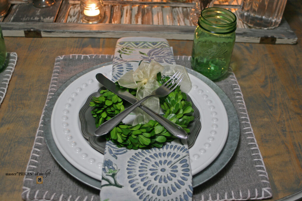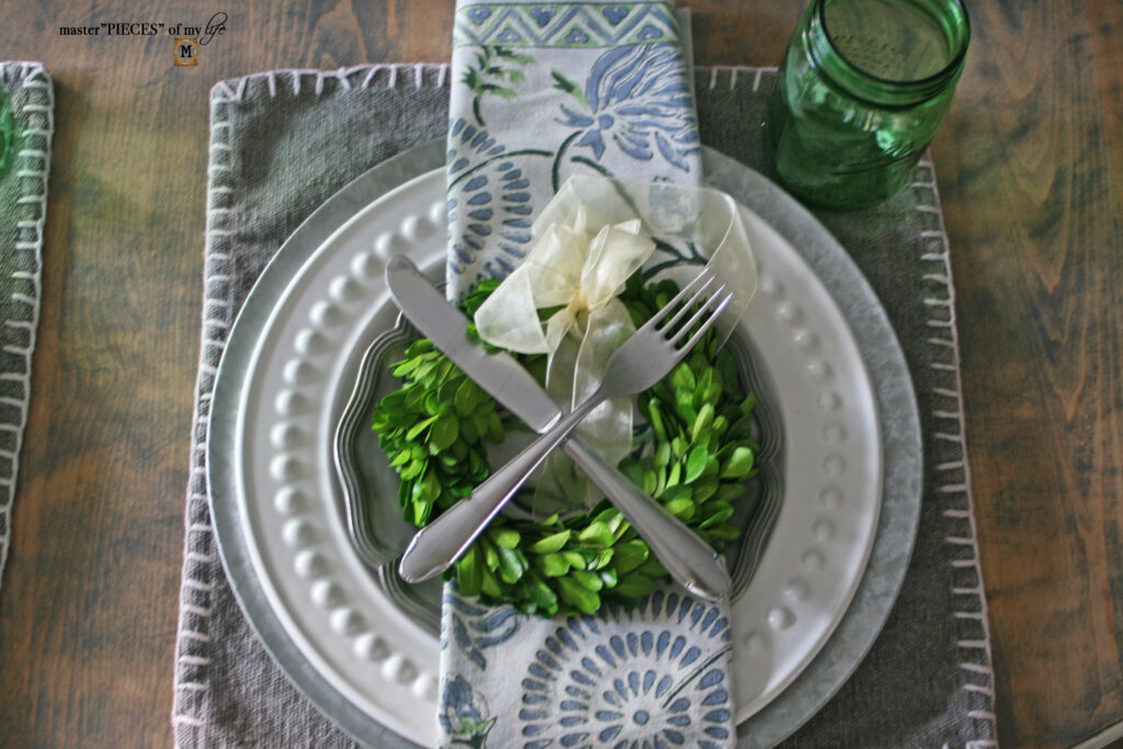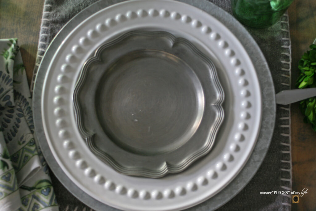 The plate stack starts with a cotton gray placemat, which is followed by a galvanized charger. The charger is then followed by a chunky white Portuguese dinner plate and a pewter accent plate. It is topped off by a preserved boxwood wreath, which adds to the spring | garden vibes, and it is all crowned by the criss-crossed silverware.