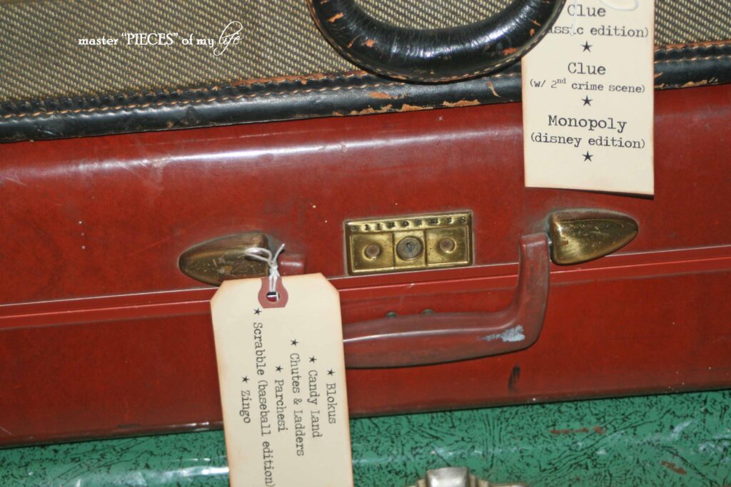 All the board games and family entertainment have been organized into my stack of old suitcases.