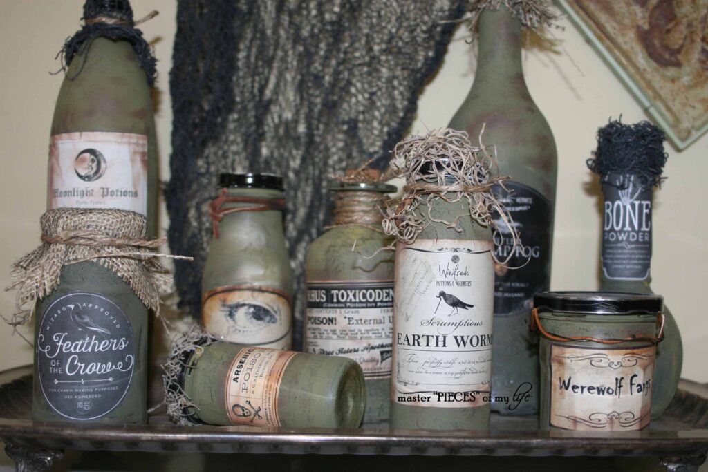 These potion and poison bottles are made from everyday household glass bottles, including sparkling water, jam, vinegar, even a candle, etc. You get the idea. There’s only one bottle I actually purchased. I bought it last year at a craft store for a different project, which never happened, so I had it kicking around.