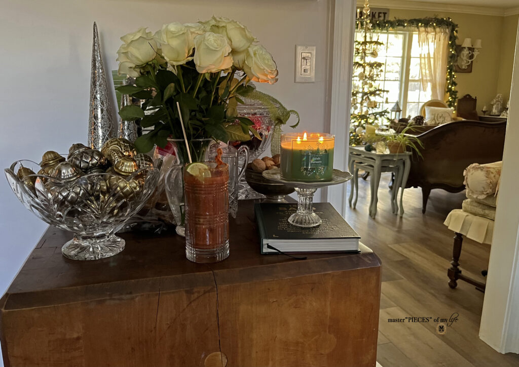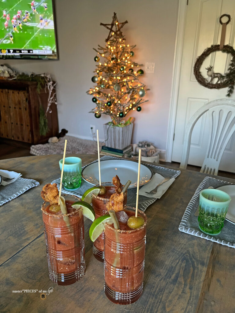 Although the Bloody Mary was the focal point in the picture below, I love the composition the hubby snapped since it captures the new floors and the change in paint from the forefront to the background. The floors were installed throughout the house and I will share all the details soon. Plus we started to repaint the interior of the house from the mossy, yellow-y green we’ve had for over a decade, which you can see in the background in the living room to this soft misty gray in the forefront. Right now the family room & the kitchen are the only rooms that have been repainted since it was all time allowed during the holiday season.