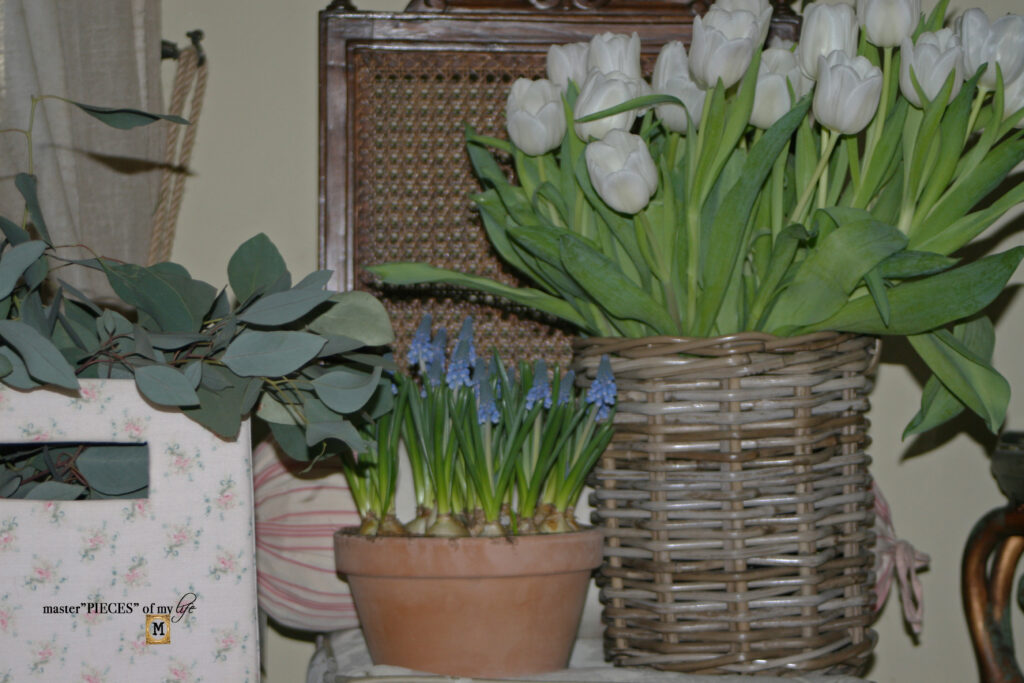 The same basket serves as a great vase, spilling over with tulips. I love tulips, they always seem to dance in arrangements.