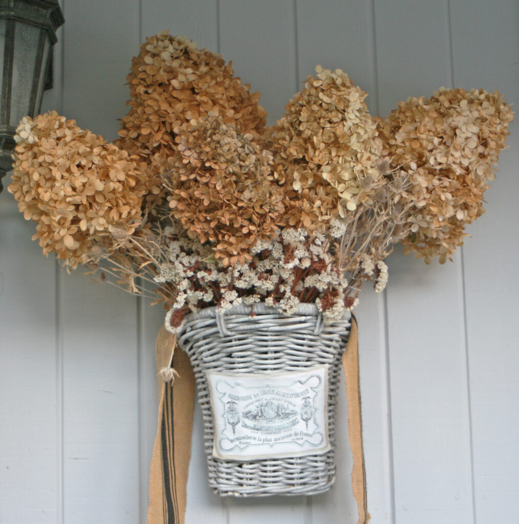 Transitioning outdoor containers with dried hydrangeas from our garden is a favorite Autumn decor technique I use every year.