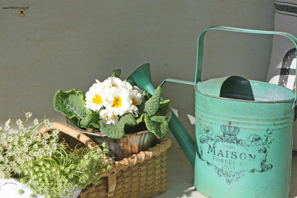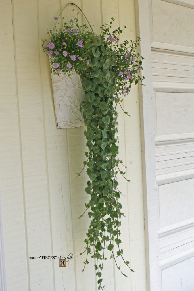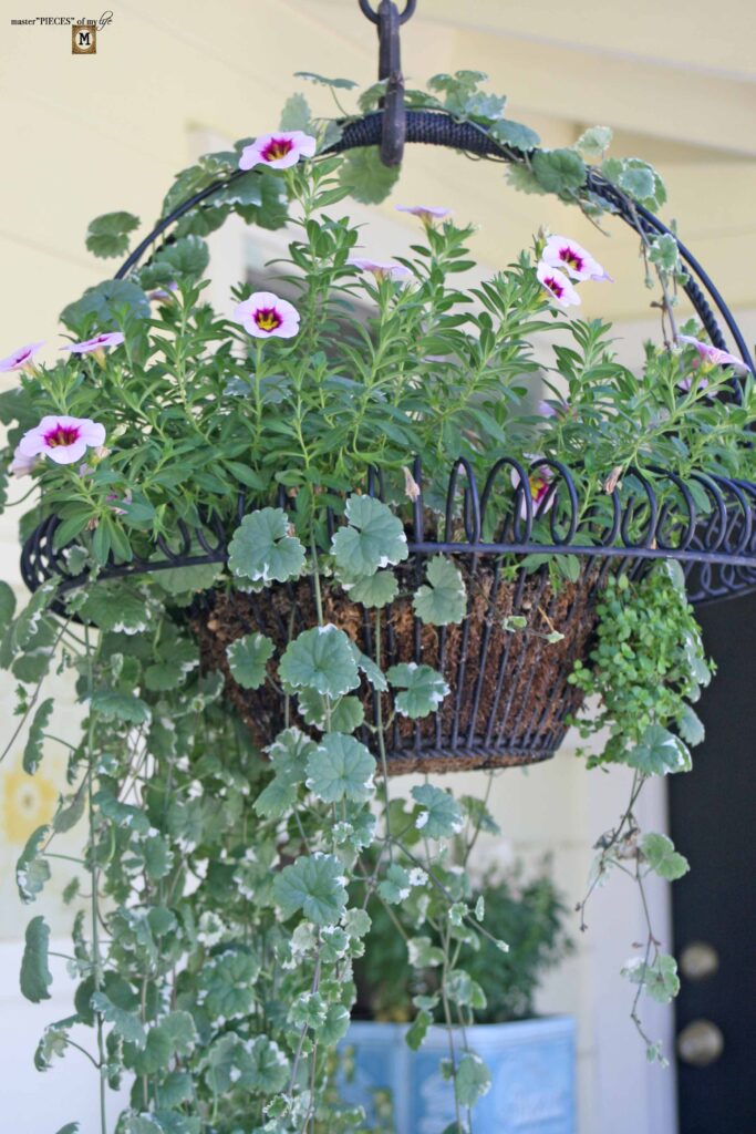 There’s nothing more welcoming than a hanging basket on your front door to greet your guests. It’s like a big smile on your home. This is actually a thrift store find I scored for a couple of dollars.