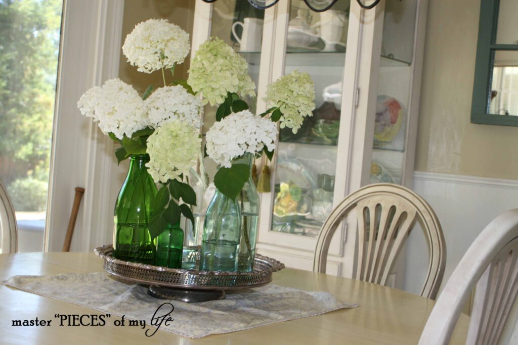 I love these hydrangeas in my green bottle collection{through the seasons – green bottle collection}. Hydrangeas are fun to arrange and they bring a brightness to the kitchen, which I love and instantly makes me smile.