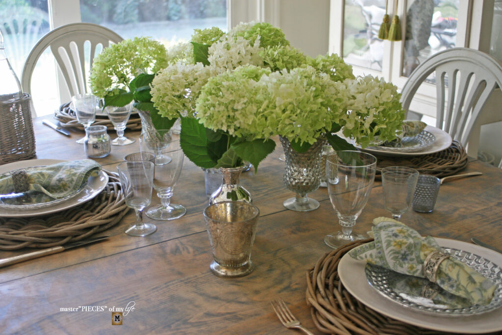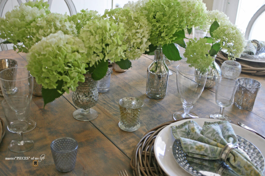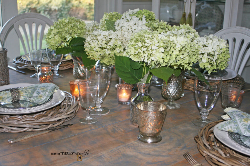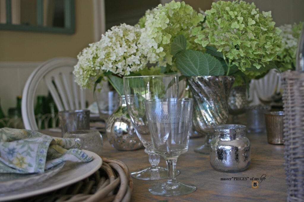 A line of mercury glass vases are casually spread down the center of the kitchen table spilling over with pretty hydrangea blooms. The vases are complimented with mercury glass votives sprinkled around the table, which create a pretty glow.