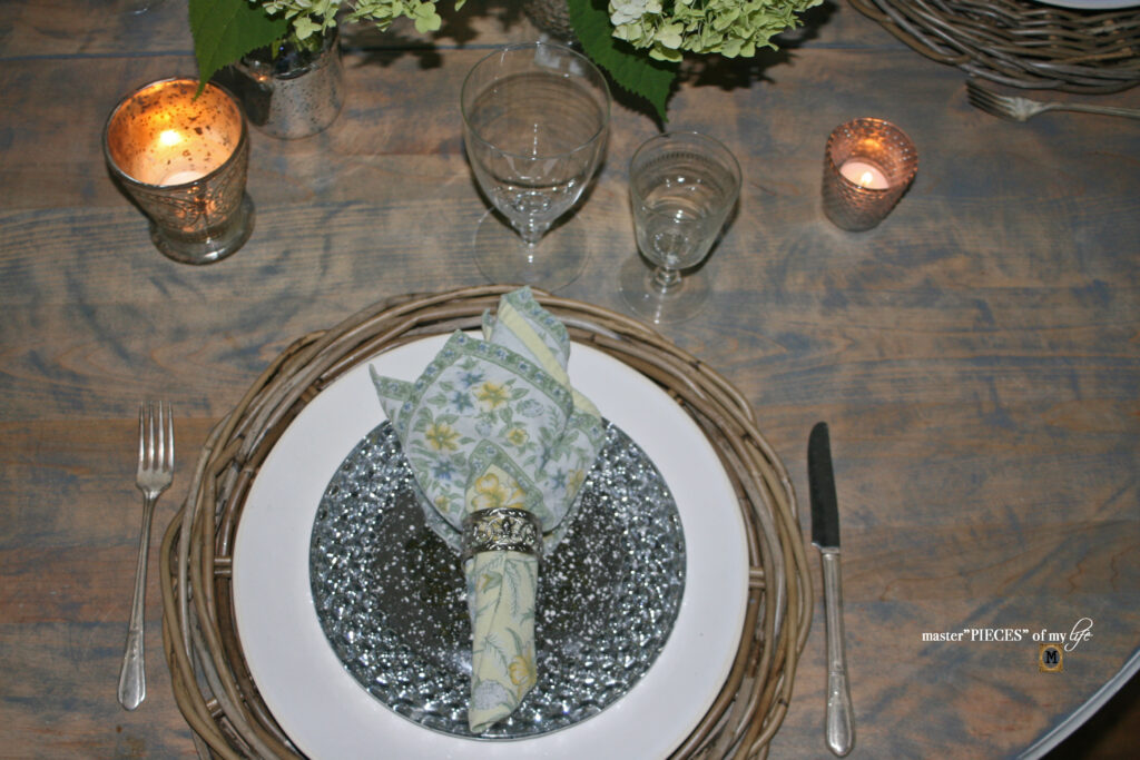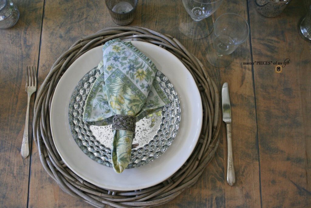 The plate stack has an accent glass plate to tie in with all the Mercury glass pieces. The dinner plate is a white Wonki Ware plate, which you can read all about here{my latest dish obsession}. The plate stack is grounded by willow chargers, which I picked up years ago at Pier1 back when the stores were still around.