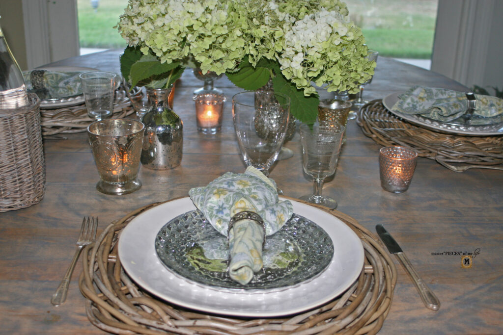 July is hydrangea season! Hydrangeas are one of my all time favorite flowers and they are in full bloom! We have several varieties in the back yard and I brought some in to create a simple but beautiful centerpiece for this summer tablescape. This hydrangea and mercury glass tablescape brings two of my favorites together.