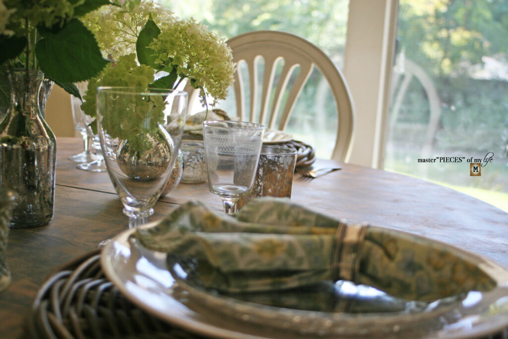 The table is pretty simple and sparse on purpose to let the hydrangeas shine! This hydrangea and mercury glass tablescape is perfect for a casual yet special meal.