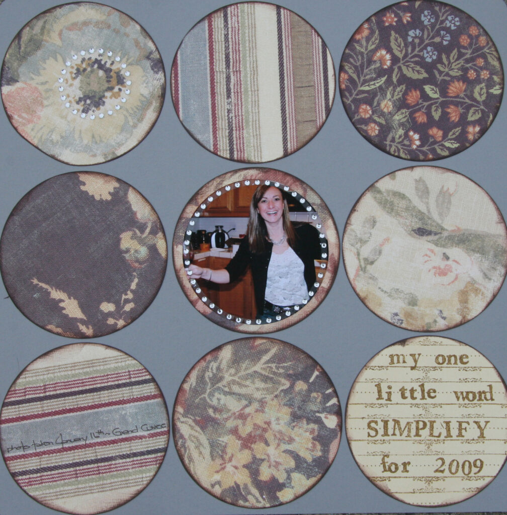 So for the second layout I chose to only use one photo in the middle.  I wanted the layout super simple for my one little word of 2009: simplify.  If you want more info about the one little word thing go here.  Instead of making a new year’s resolution for the past few years I have chosen a little word to be my guiding light throughout the year.  Last year it was “order” as in getting my life in order (I think i was about 75% successful).  So once again maximizing my efficiency factor, scrapped my word for the year, which has been on my to do list for a month now AND created a workshop sample.  good times!  I love that.