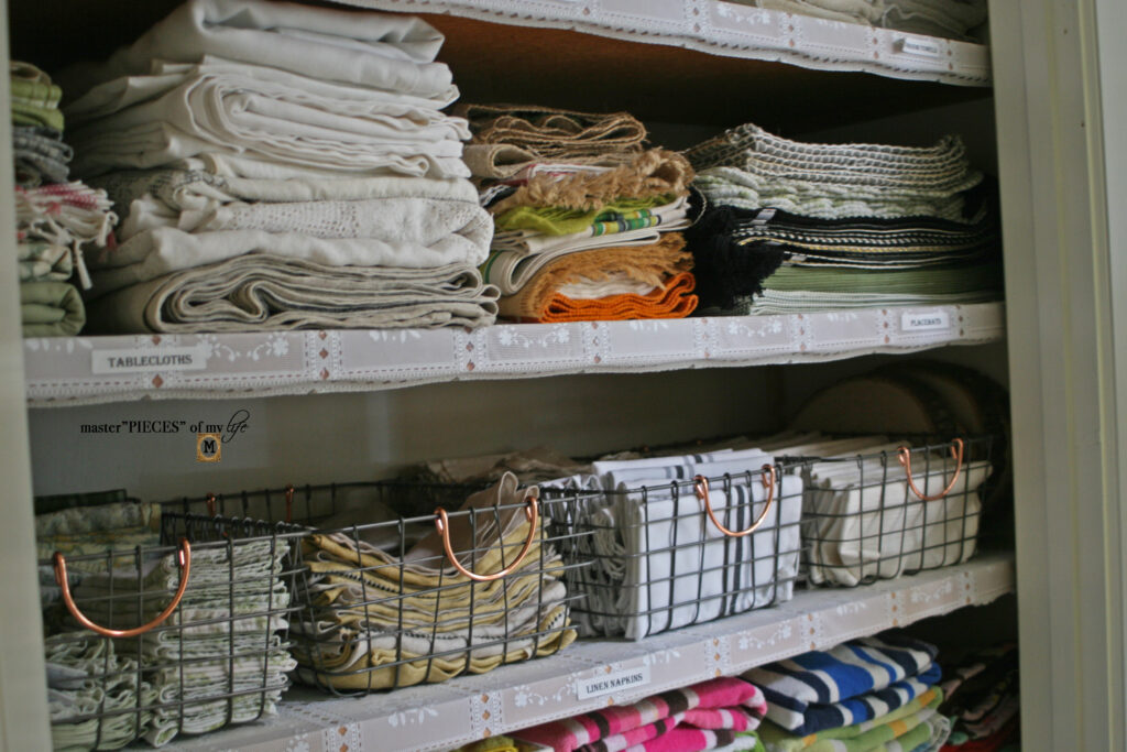 One of my favorite things are the wire baskets. I used them to store many of my tabletop linens by color families. They are much easier to use and pull to pick just the right napkins. I can access the ones in the back simply by pulling out the basket rather than making a mess in the way back of the closet when I grab something and or have difficulty seeing it so I pull out the wrong item and then it never gets put back the right way. You know what I mean? I think some of you can relate.