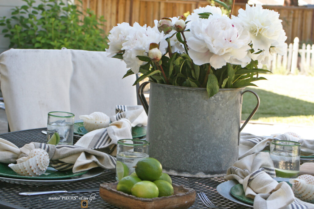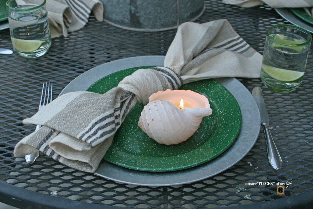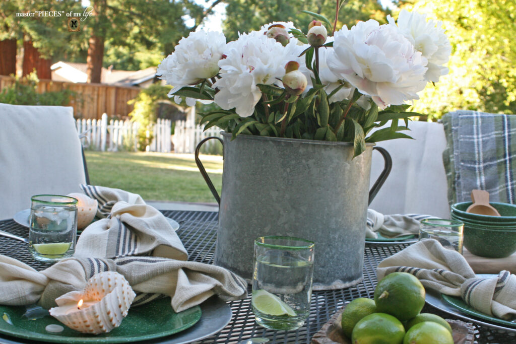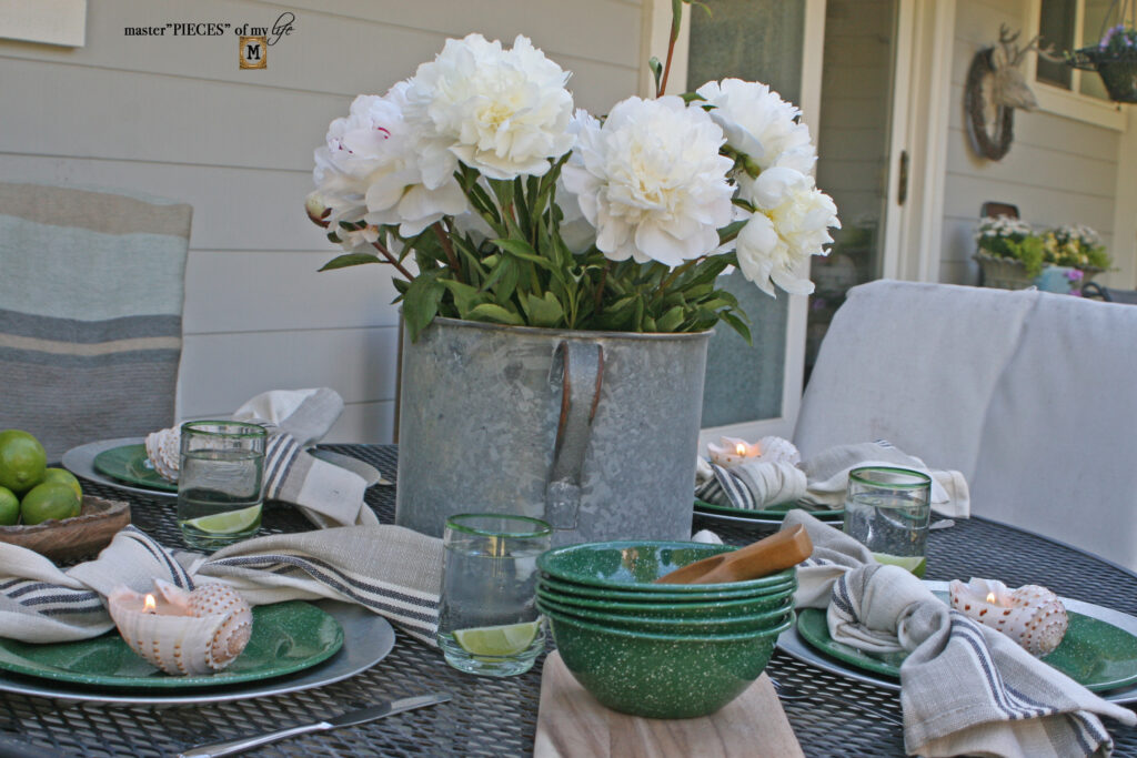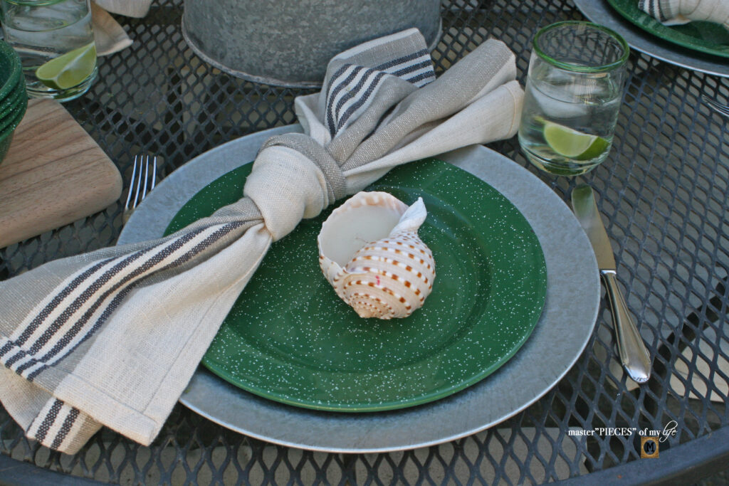 And although I love all the galvanized and enamel feels they are all hard, cold surfaces. Some fabric texture helps bring balance with softness, comfort and warmth.  Cotton linen napkins with a simple knot instead of a fancy fold or napkin ring add casualness but are still pretty and a little bit refined.