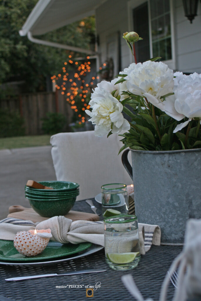 To compliment the relaxed vibe I also like to use outdoor friendly tabletop items.  On this table I chose galvanized chargers and enamel dishes with wooden accents.  I absolutely love enamelware!  Remember this post{metals III – enamelware}.  The green dishes were a recent find while thrifting.  And my love for enamelware is closely followed by my love for galvanized pieces {metals IV – galvanized}.