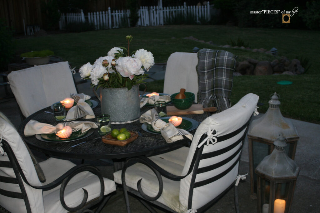 Twinkle lights always create a beautiful setting too whether strung on your home or on trees or anywhere really.  I have manzanita branches in a vintage olive bucket strung with lights in the corner of the patio that always add a festive background.