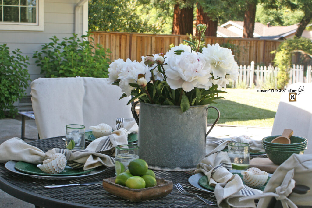 Being outside we are surrounded by flora & fauna and it’s only fitting to include some pretty flowers and/or plants in our tablescapes.  Instead of perfectly coiffed  floral arrangements though, a bunch of pretty blooms plopped inside a zinc bucket is perfectly acceptable.  Use an outdoor planter with some lavender or any casual outdoor container with freshly clipped herbs to immediately set the relaxed tone.