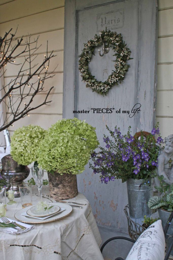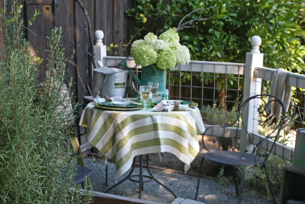 This is a green inspired table scape in the veggie garden. We sit in this spot with morning coffee or an evening cocktail, but t’s a real treat to enjoy a leisurely meal in this spot.