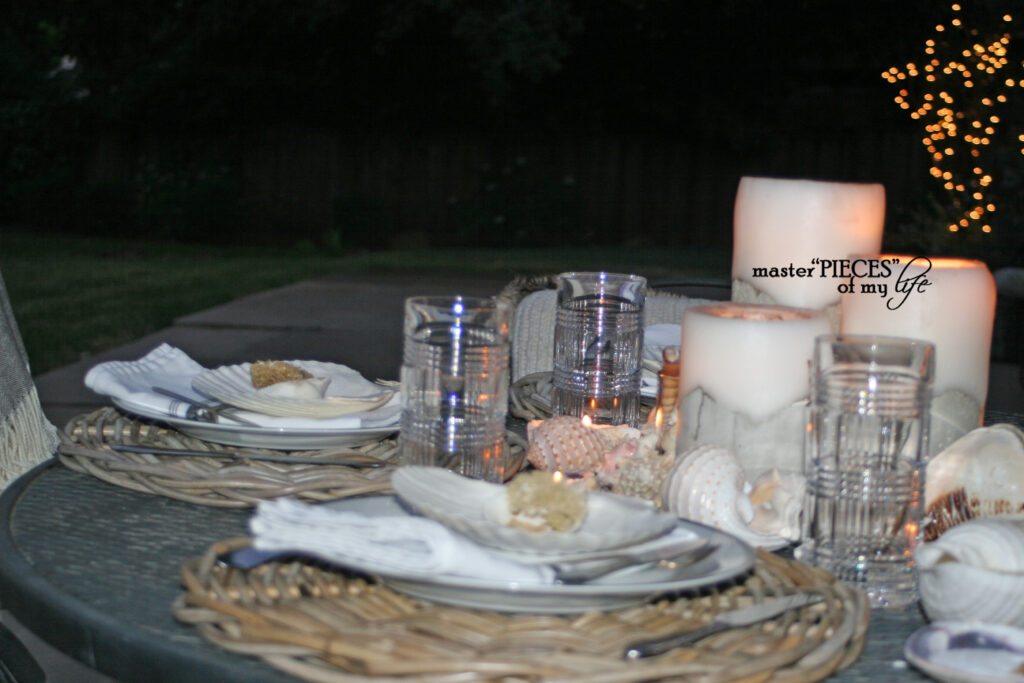 Setting a table outdoors, which is not centered around a certain event or holiday, holds so many theme options. You can use a nautical theme, a garden theme, a floral theme, to name a few. One of my favorite summertime decor muses are seashells.