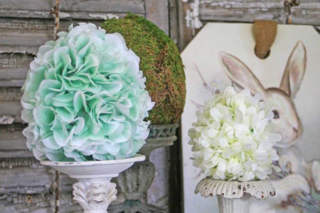 I’m a big proponent of using what you have before buying new stuff. All the materials I used were in my craft stash with the exception of the DT trays. The selected finishes and embellishments coordinate and compliment the other eggs. I had the baby breath bundles left over from this project {Moss Bunny Inspired Table}, and the pearls were left over from this project {Christmas Ornament DIY}. I love getting double duty from supplies. The ruffled blueish teal ribbon and the ice blue ric rac were from my scrapbook days stash, while the metal ribbon is from the Dollar Tree, which I used before here {crown napkin rings}.
