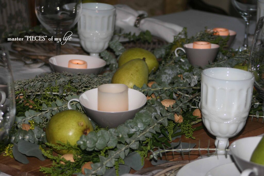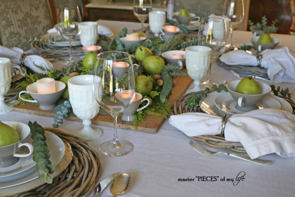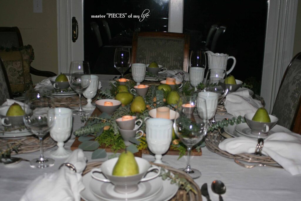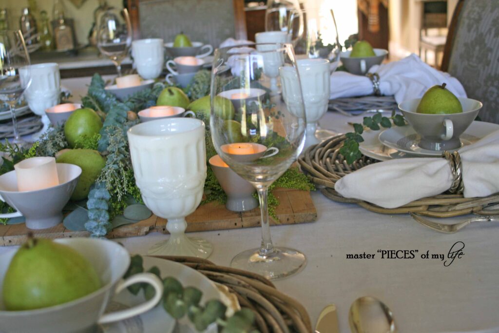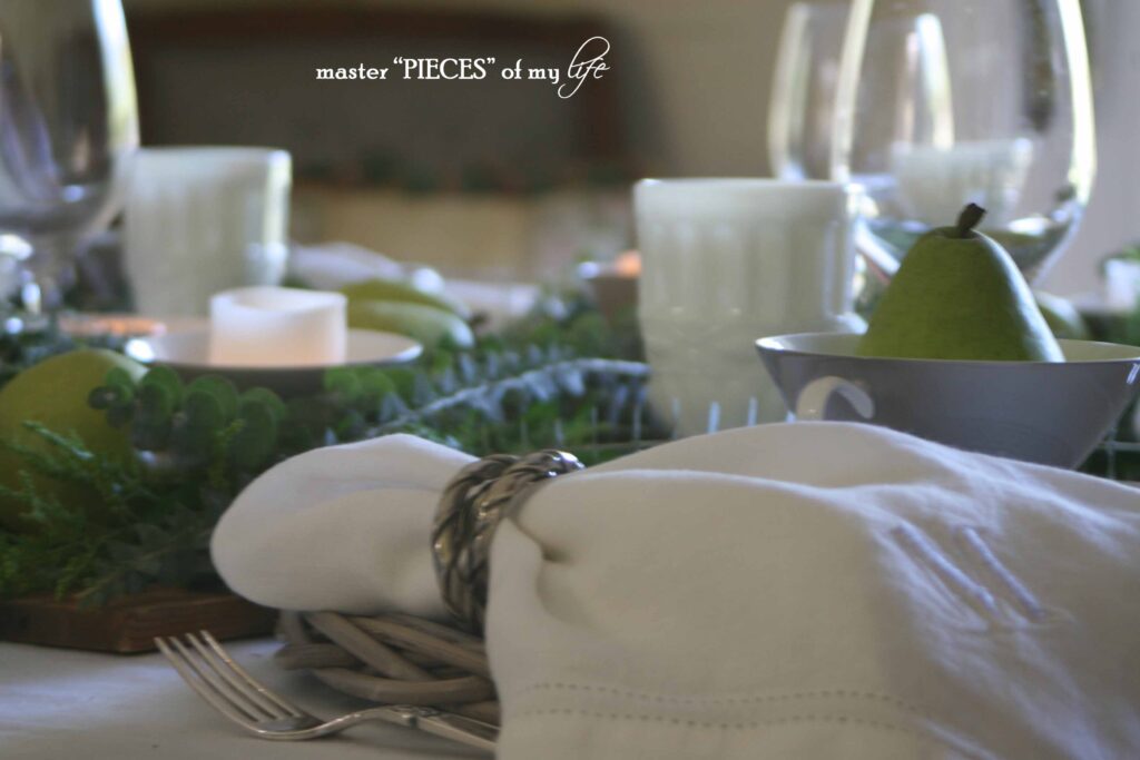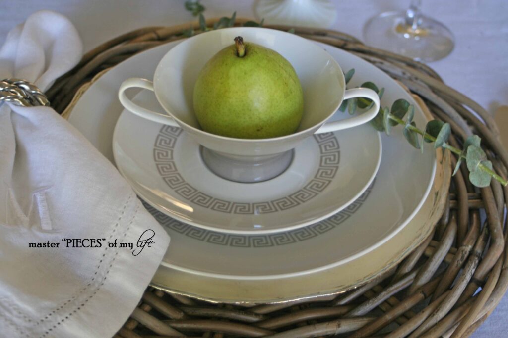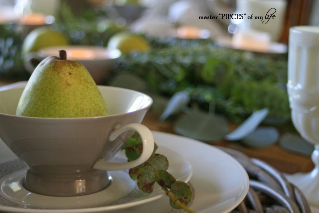So…anyway…I wanted to use my parent’s china as inspiration for this fall season. I decided that pears would be my muse for the table and while I was pondering on a centerpiece in Trader Joe’s I spied 3 last bundles of different varieties of eucalyptus for 2.49 each.
