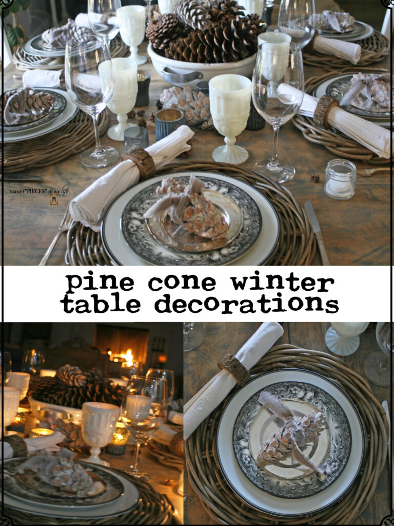 Winter can be drab and carry on too long for many of us so the more reason to set a pretty table enjoying winter touches inside. I am embracing some of the nature the season brings us, using pine cones as the main table decoration.