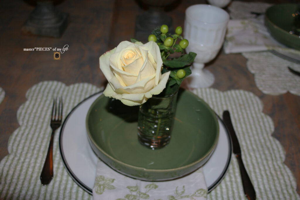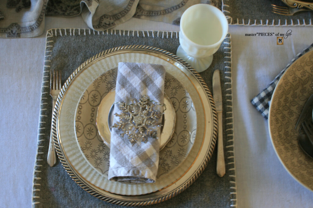 And because I always need a little vintage bling on all my tables, I include vintage silverware and a sterling canapé plate at the top of the plate stack to showcase the place setting pine cones. These could be used as place card holders if wanted.