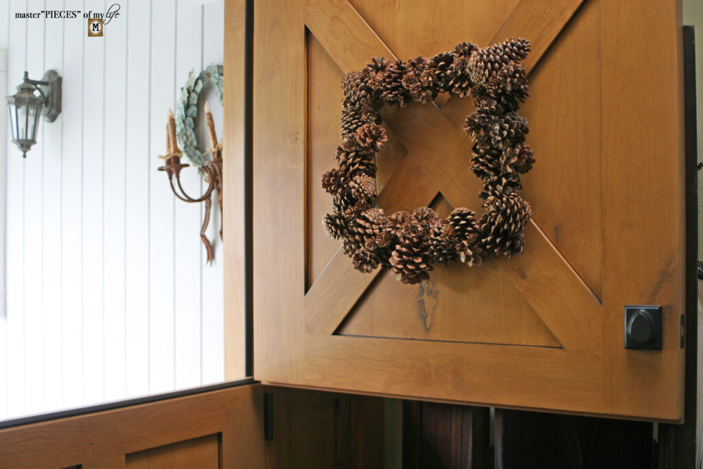 I styled the newly crafted pine cone wreath on my front door. I left it plain, and I love how it looks on our fairly new dutch door. For the holidays I think I might add some ribbon and maybe greenery.