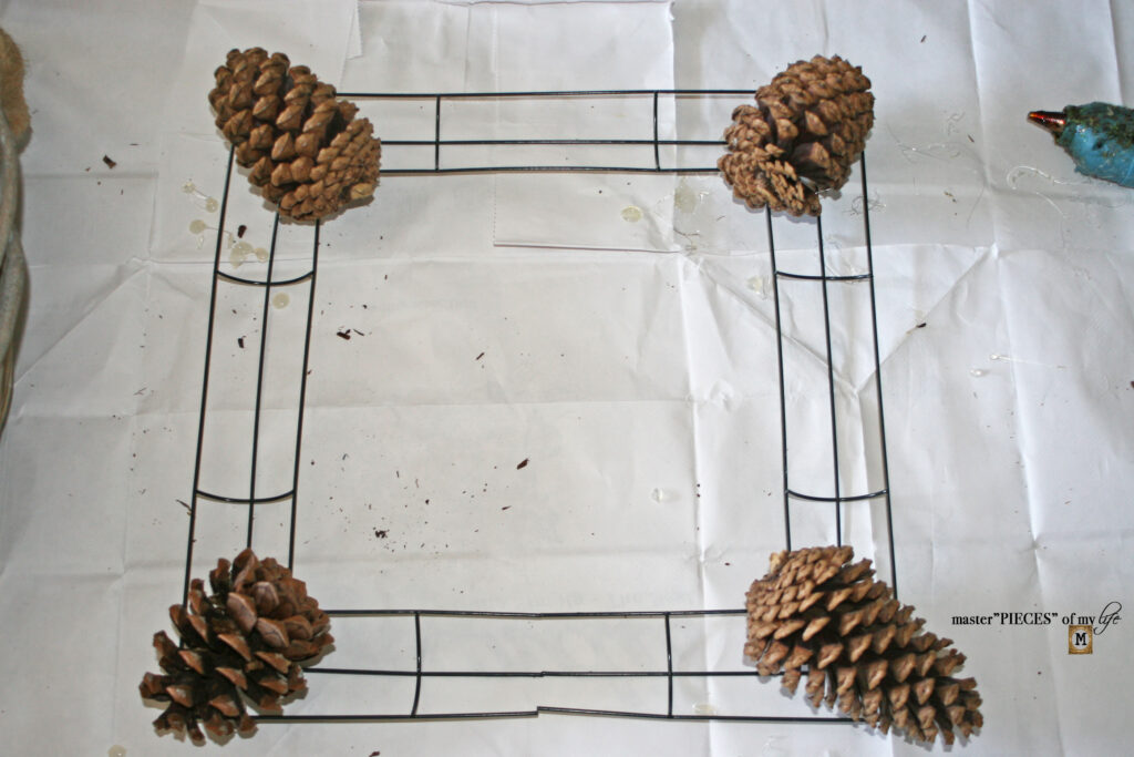 I picked a larger sized pine cone with a longer body for the corners to serve as anchors.